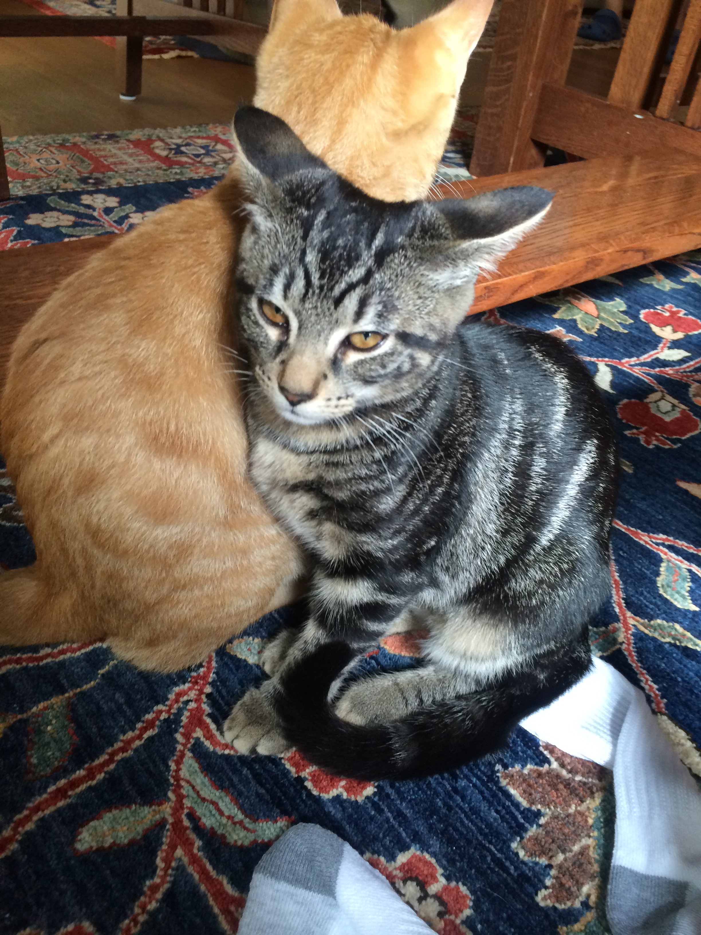 The first words emerge slowly, like extracting the quarter-inch of honey that remains at the bottom of the jar. It’s only been a few weeks since I’ve put pen to paper, as it were, but that writing muscle of mine loses definition quickly. The days between my last writing session and this one have been full of profound and mundane activities – organizing the kids’ clothing drawers and back-to-school shopping, saying goodbye to the preschool community our family has been part of for the last five years. Today Helen started Kindergarten and Caleb started 2nd grade. It has taken time, but I bit by bit I’m beginning to feel like part of the school community. Oh, and we adopted 2 4-month-old kittens, a brother and sister, Hana and Hilo:
